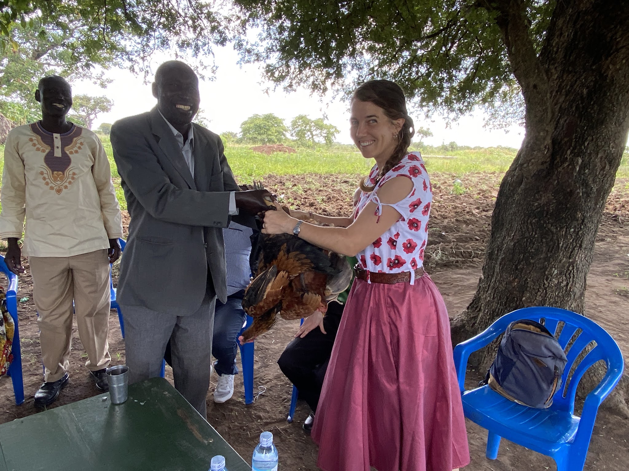 Sara accepting a gift of chickens - one for her, one for Anthony, and one for me. They were good: